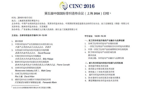 第五届中国国际非织造布会议(上海2016)定于2016年10月13日在上海召开。