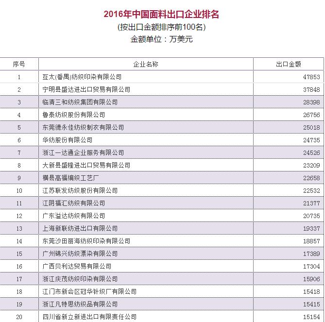 中国海关统计,2016年全国面料出口金额528.5亿美元,下降3.6%。出口平均单价1.28美元/公斤,同比下降8.5%。进口金额56.7亿美元,下降10.8%。进口呈现量跌价涨,平均单价2.26美元/米,同比增长9.2%。2016年12月面料出口金额增长。