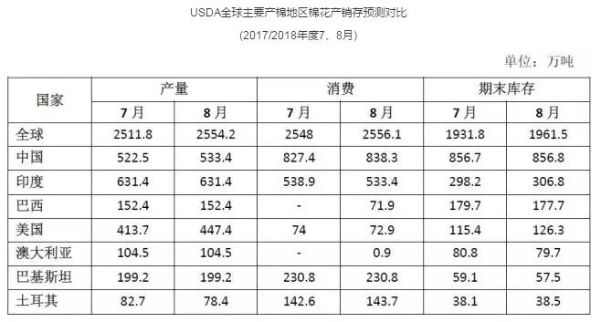 因中国棉花消费量上调了10.9万吨,全球棉花消费量调高了8.1万吨,增幅为3.3%,为近5年最大增幅。印度棉花消费量下调5.5万吨,美国棉花消费量下调了1.1万吨。由于供应增加和年度初的定购强劲,美棉出口量上调15.3万吨。