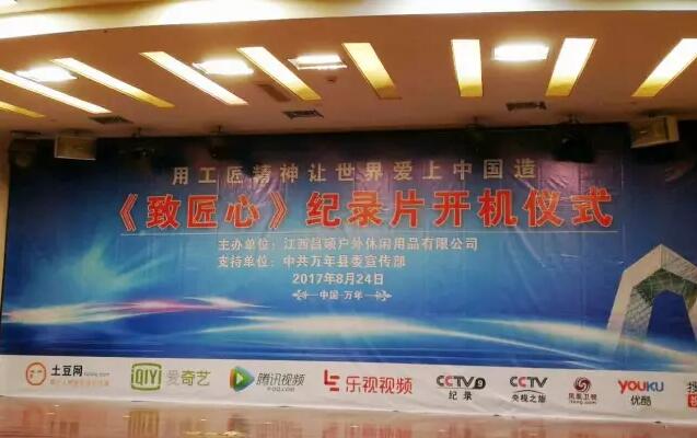 8月24日,央视纪录片频道《致匠心》纪录片开机仪式,在江西上饶市万年县举行。江西昌硕户外休闲用品有限公司作为国内唯一一家高档伞用面料生产企业,经过中国轻工业联合会推荐和央视“匠心智造”考察团终审,最终入选成为被拍摄企业。