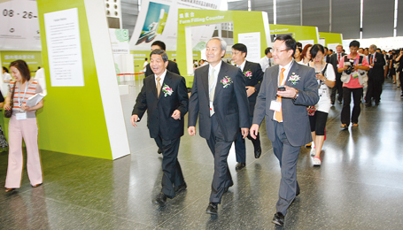 中国纺织工业协会会长杜钰洲(中)在中国纺织工业协会副会长、中国家纺行业协会会长杨东辉(左一)和中国贸促会纺织行业分会副会长、中国家纺行业协会副会长杨兆华(右一)陪同下参观第十四届国际家纺及辅料博览会