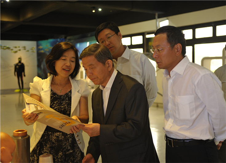 中国纺织工业协会副会长杨东辉、中国国际贸易促进委员会纺织行业分会常务副会长徐迎新、秘书长梁鹏程参观台湾纺研所功能面料展区