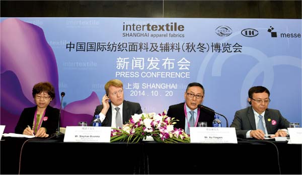 10 月20 日上午, 中国国际纺织面料及辅料(秋冬)博览会新闻发布会在W1-M1会议室举行,中国国际贸促会纺织行业分会常务副会长徐迎新、副会长林云峰,法兰克福展览亚洲控股有限公司董事总经理鲍思丰,中国纺织信息中心主任乔艳津出席发布会。