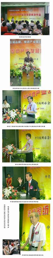 为了很好地宣传家纺区域品牌,余杭区委、取政府还专门在博览会上召开了“余杭家纺产业发展新闻发布会”,详细推介杭州市余杭区的研发中心、产业园区和近况和发展前景,吸引了30余家新闻媒体。中国纺织工业协会副会长许坤元、中国家用纺织品行业协会会杨东辉、浙江省经贸委副主任王素娥、杭州市经委主任赵纪来等众多领导出席了新闻发布会。