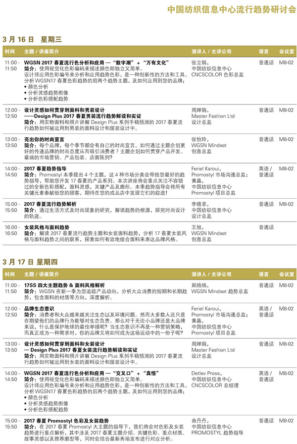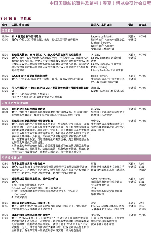 您现在的位置是:首页 > 展会报道 2016春夏面辅料展‖专题研讨 且听王者论道 来源:纺织贸促会官微 发布日期:2016-03-09 字体: 【小】 【中】 【大】 有人说,在大者云集的intertextile春夏面辅料展,任意两家王者企业的交谈都可能已经触摸到了整个行业未来的走向,故而,听行业王者论道,成了众多观众及展商来intertextile春夏面辅料展的重要任务之一。体贴入微的主办方当然了解大家的这种想法,这不,双手奉上诚意满满的研讨会及专题小组会日程,3天的时间多达46场次,还愁不能满载而归吗? 分享: 热门文章: 2025intertextile春夏 | “友礼”同享齐观展... [2025-02-19] 2024年我国纺织行业经济运行总体平稳 [2025-02-17] 聚焦绿色智慧融合 展示产业用纺织品新趋势 [2025-02-11] 响应政策 落实服务 | PH Value义乌展全力“备战”中 [2025-02-11] 【亮星季】第一期正式开启 | 商贸先行,品质好礼享不停 [2025-02-10] 展会直通车