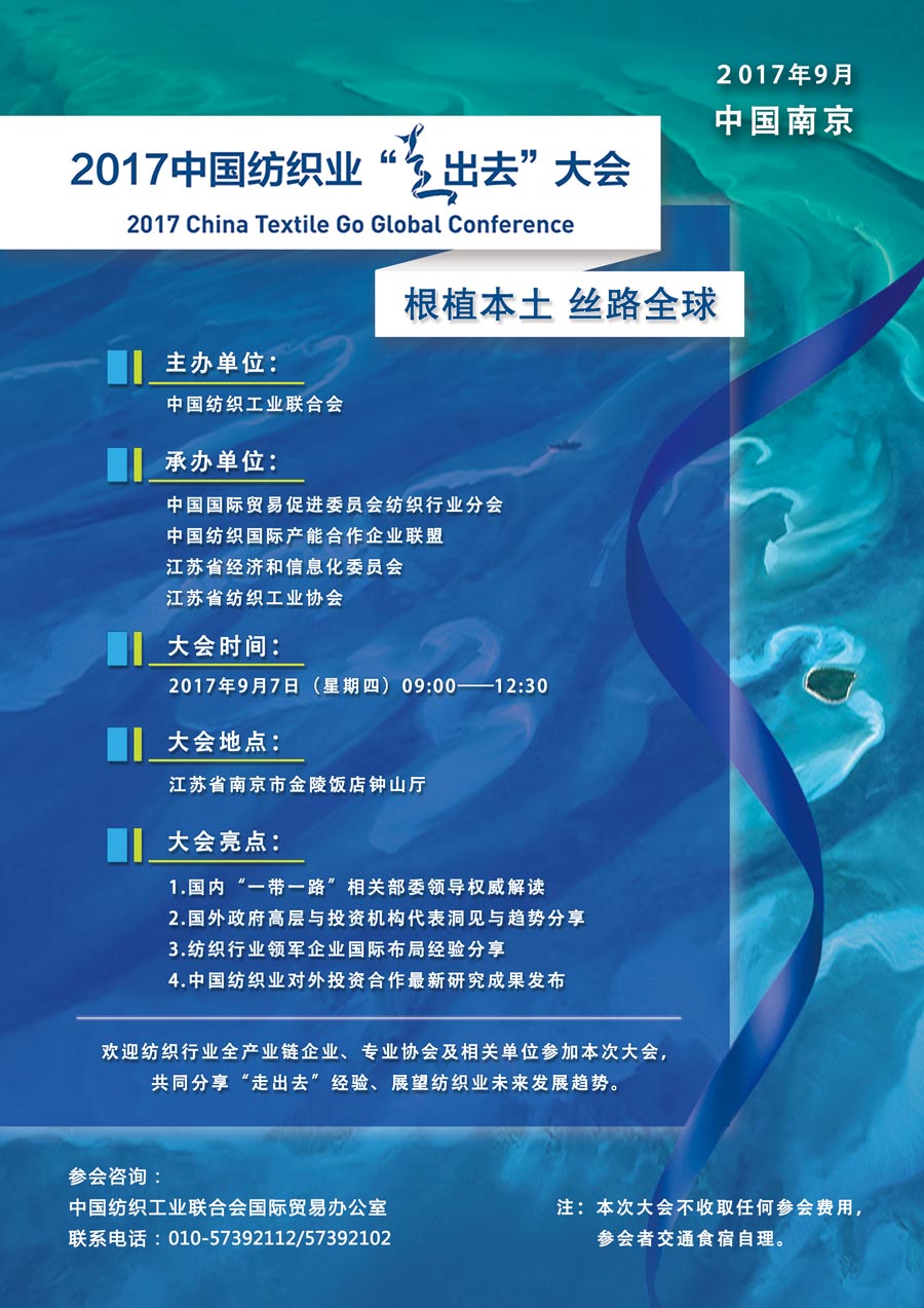 根植本土 丝路全球--- 2017中国纺织业"走出去"大会将于9月在江苏南京召开