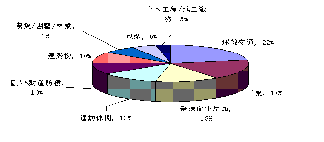 2)工业(18%),工业、生物科技、光电用之特殊纤维(碳纤、光纤、耐化学、抗静电)等等。