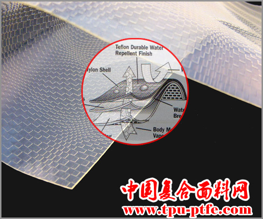利用聚四氟乙烯塑料树脂的成孔特性,采用双向拉伸方法制成的微孔薄膜。该膜表面每平方厘米能达到十多亿个微孔,每个微孔直径(0.1μm-0.5μm)比水分子直径(20μm-100μm)小几百倍,比水蒸气分子(0.0003μm-0.0004μm)大上万倍,使水蒸气能通过,而水滴不能通过,利用这种微孔结构可达到优秀的防水透湿功能;另外因为该孔极度细小和纵向不规格的弯曲排列,使风不能透过,从而又具有防风性和保暖性等特点。经与其他面料复合后,广泛应用于军队服装,医用服装,休闲服装,消防、防毒、浸水作业等特种防护服,户外运动服装,鞋、帽、手套等辅料以及睡袋、帐篷、雨具等材料。