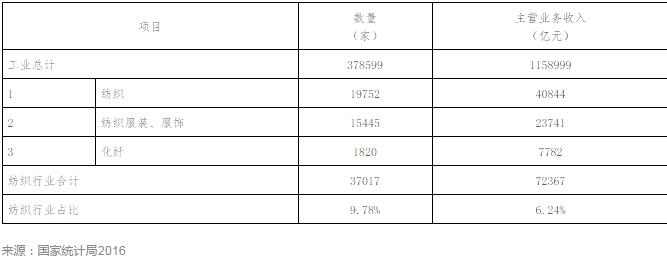 据统计,2016年我国规模以上纺织企业主营业务收入达72367亿元,占全国规模以上企业营业收入的6.24%,纺织行业规模以上企业数量达37017家,占全国规模以上企业数量的9.78%。