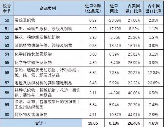 按照ITC口径,涉及加税的HS50-60章商品对美2017年出口金额如下: