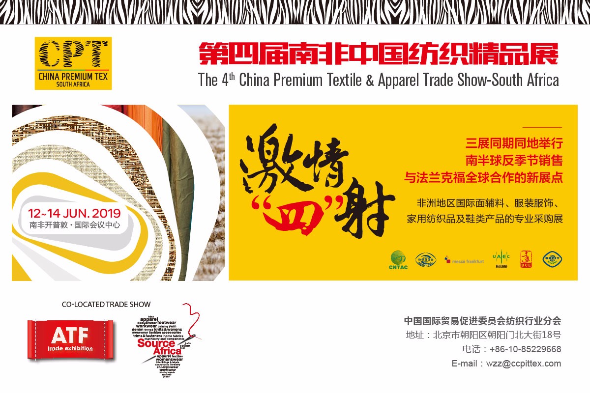 第四届中国纺织精品展(南非)暨南非纺织服饰鞋类展览会将于2019年6月12-14日与南非国际纺织品及鞋类进口贸易展览会(ATF)和SOURCE AFRIC展会同期同地在南非开普敦国际会议中心举办。