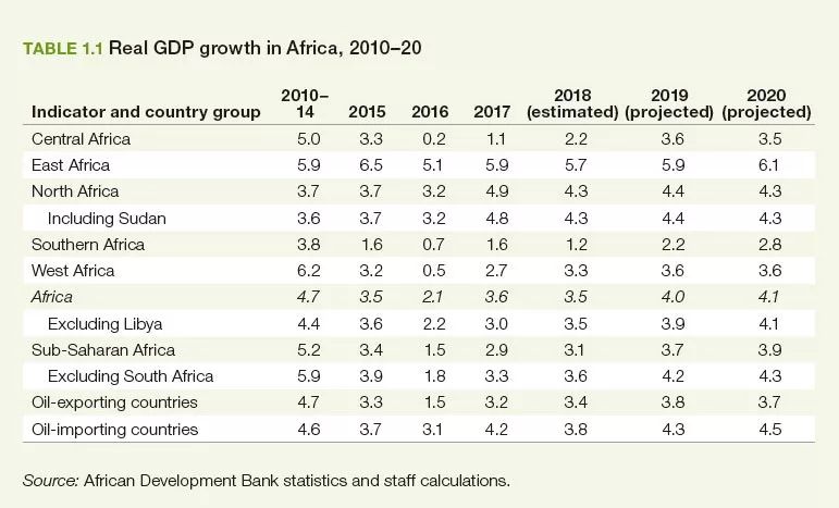非洲大陆2018年GDP平均增长率3.5%,与2017年持平,比2016年提高1.4%。非洲的GDP增长期望虽然不如中国和印度高企,但是仍领先于其他在新兴和发展经济体中。
