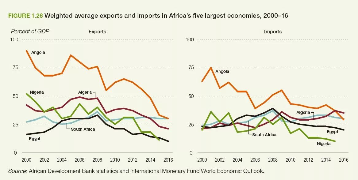 最近几年内非洲进出口情况的的趋势变动也是由非洲地区进出口需求的不一致性决定的。比如,北非地区旅游收入的减少(安全问题日益引起关注),西非和中非地区原材料价格的下降都是导致这几个地区出口波动的原因。在中非地区,出口额占GDP贡献率从2011年至2016年降低了15个百分点,主要是由于外部需求减少以及这些地区国家高涨的通货膨胀导致的货币贬值引起的。2010年之后非洲大多数国家的出口占GDP比例都大幅降低(南非由于出口产品的多样性而不在此列);进口展GDP比例的表现在东非有所下降,但是在中非和北非持续增强。