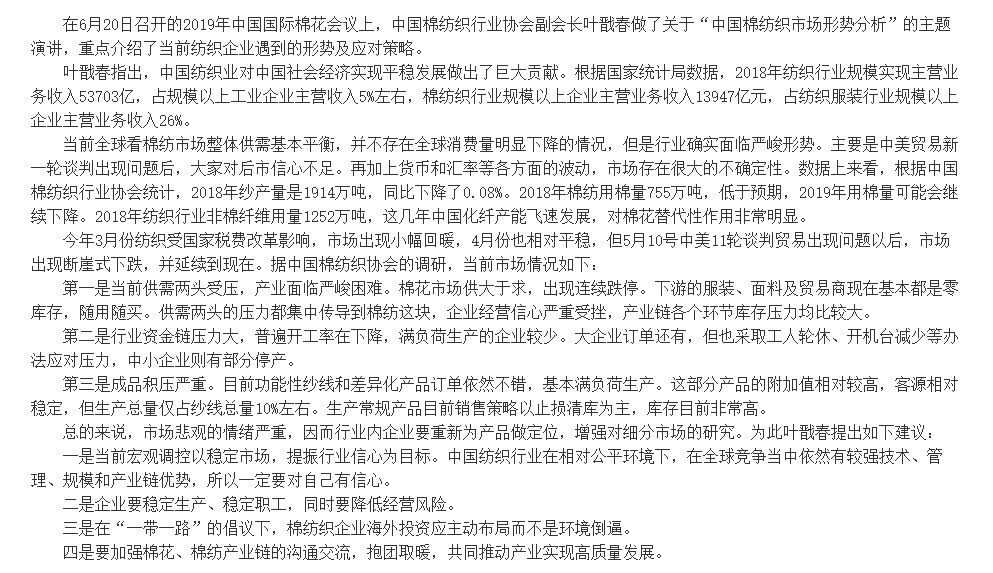 您现在的位置是:首页 > 要闻 2019国际会议:中国棉纺织市场形势分析 来源:中国棉花信息网 发布日期:2019-06-25 字体: 【小】 【中】 【大】 分享: 热门文章: 2025intertextile春夏 | “友礼”同享齐观展... [2025-02-19] 2024年我国纺织行业经济运行总体平稳 [2025-02-17] 聚焦绿色智慧融合 展示产业用纺织品新趋势 [2025-02-11] 响应政策 落实服务 | PH Value义乌展全力“备战”中 [2025-02-11] 【亮星季】第一期正式开启 | 商贸先行,品质好礼享不停 [2025-02-10] 展会直通车