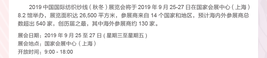您现在的位置是:首页 > 要闻 2019秋冬纱线展 |又快又准地找到心仪展商,商贸配对来帮忙 来源:yarnexpo纱线展 发布日期:2019-08-23 字体: 【小】 【中】 【大】 分享: 热门文章: 2025intertextile春夏 | “友礼”同享齐观展... [2025-02-19] 2024年我国纺织行业经济运行总体平稳 [2025-02-17] 聚焦绿色智慧融合 展示产业用纺织品新趋势 [2025-02-11] 响应政策 落实服务 | PH Value义乌展全力“备战”中 [2025-02-11] 【亮星季】第一期正式开启 | 商贸先行,品质好礼享不停 [2025-02-10] 展会直通车