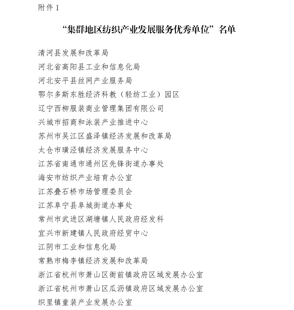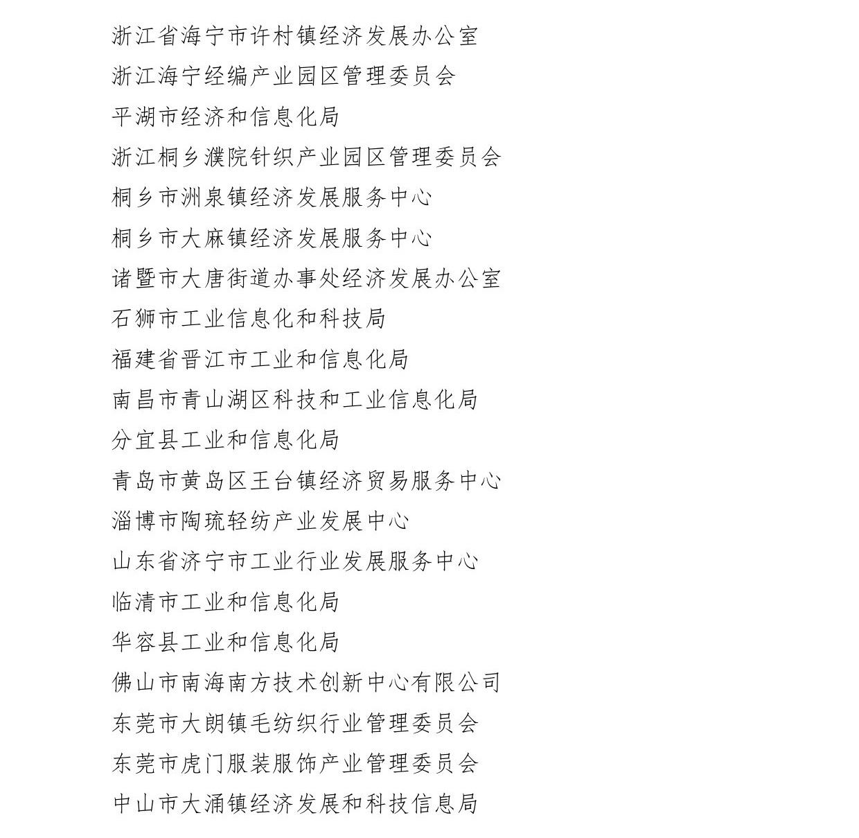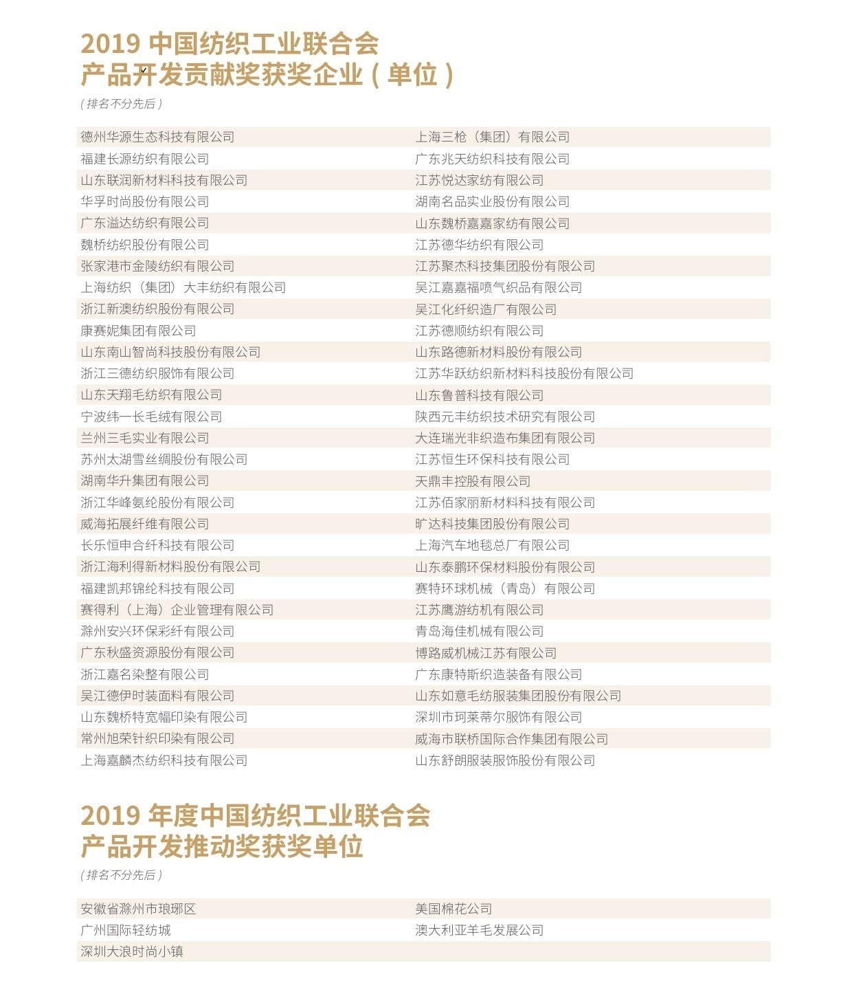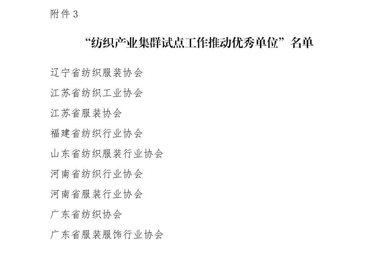 会议还为辽宁省海城市等197个纺织产业集群试点地区授牌。确定山东省昌乐县等七个地区为纺织产业集群试点地区并授牌。颁发“集群地区纺织产业发展服务优秀单位奖”、“纺织产业集群试点工作推动优秀单位奖”。颁发“第八届全国纺织行业管理创新成果奖”。颁发“2019年度十大类纺织创新产品奖”。颁发“2019年度中国纺织工业联合会产品开发贡献奖”。