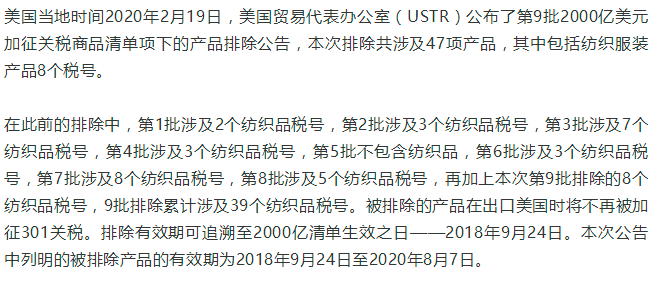 您现在的位置是:首页 > 要闻 含纺织服装8个税号,美发布2000亿美元加税产品第九批排除清单 来源:中国纺织品进出口商会 发布日期:2020-02-24 字体: 【小】 【中】 【大】 分享: 热门文章: 2025intertextile春夏 | “友礼”同享齐观展... [2025-02-19] 2024年我国纺织行业经济运行总体平稳 [2025-02-17] 聚焦绿色智慧融合 展示产业用纺织品新趋势 [2025-02-11] 响应政策 落实服务 | PH Value义乌展全力“备战”中 [2025-02-11] 【亮星季】第一期正式开启 | 商贸先行,品质好礼享不停 [2025-02-10] 展会直通车