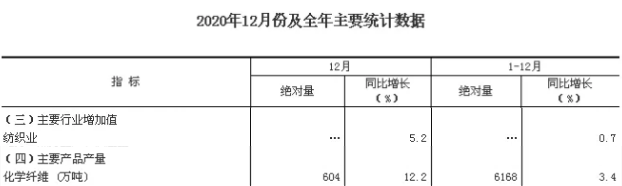 根据国家统计局数据,2020年1-11月,全国规模以上纺织企业工业增加值同比下降3.1%,营业收入同比下降9.7%,利润总额同比下降8.6%,固定资产投资完成额同比下降约18%。主要大类产品中,仅有无纺布产品明显增加,1-11月同比增长14.4%;化纤产量进入四季度后实现微幅正增长,其他产品产量均较上年同期减少。