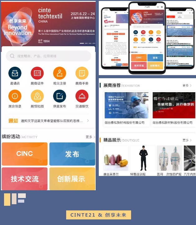 CINTE21继续设立创新展示区,创新展示区以“乘风破浪二十载 创新绿色新篇章”为主题。包括三个部分:中国产业用纺织品行业协会成立20周年回顾篇;产业用纺织品行业“十三五”科技成果篇;非织造行业绿色可持续发展篇。涵盖大健康纺织品、功能纺织材料及安全防护类产品等。