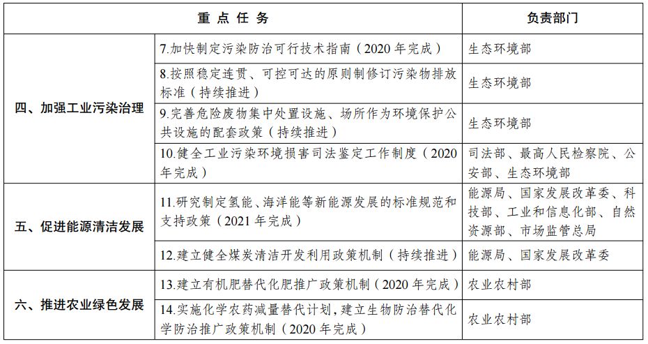 (六)加强工业污染治理。全面推行污染物排放许可制度,强化工业企业污染防治法定责任。加快制定污染防治可行技术指南,按照稳定连贯、可控可达的原则制修订污染物排放标准,严格环境保护执法监督,实现工业污染源全面达标排放,鼓励达标企业实施深度治理。完善危险废物集中处置设施、场所作为环境保护公共设施的配套政策。建立健全责任清晰、程序合理、科学规范的生态环境突发事件预警和应急机制,建立生态环境突发事件后评估机制。健全工业污染环境损害司法鉴定工作制度,建立完善行政管理机关、行政执法机关与监察机关、司法机关的衔接配合机制,促进工业污染治理领域处罚信息和监测信息共享,充分发挥检察机关公益职能作用,形成工业污染治理多元化格局。(最高人民法院、最高人民检察院、公安部、司法部、生态环境部、工业和信息化部、国家发展改革委、财政部等按职责分工负责)