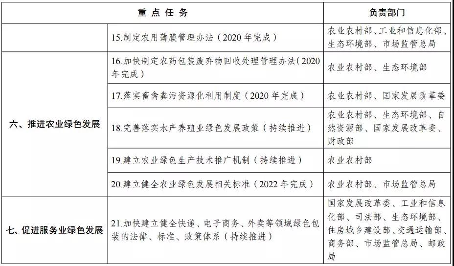 (八)推进农业绿色发展。以绿色生态为导向,创新农业绿色发展体制机制,开展农业绿色发展支撑体系建设,创新技术体系、健全标准体系、延伸产业体系、强化经营体系、完善政策体系,为农业绿色发展提供保障。大力推进科学施肥,建立有机肥替代化肥推广政策机制。实施化学农药减量替代计划,建立生物防治替代化学防治推广政策机制,支持研发推广农作物病虫害绿色防控技术产品。制定农用薄膜管理办法,建立全程监管体系,支持推广使用生物可降解农膜。加快制定农药包装废弃物回收处理管理办法。完善农作物秸秆综合利用制度,以县为单位整体推进秸秆全量化综合利用。以肥料化和能源化为主要利用方向,落实畜禽粪污资源化利用制度。完善落实水产养殖业绿色发展政策,依法加强养殖水域滩涂统一规划。建立饲料添加剂和兽药使用规范,健全病死畜禽无害化处理机制。稳步推进耕地轮作休耕制度试点。健全农业循环经济推广制度,建立农业绿色生产技术推广机制。落实农业绿色发展税收支持政策。建立健全农业绿色发展相关标准,加快清理、废止与农业绿色发展不适应的标准和行业规范。(农业农村部、国家发展改革委、工业和信息化部、财政部、自然资源部、生态环境部、水利部、税务总局、市场监管总局等按职责分工负责)