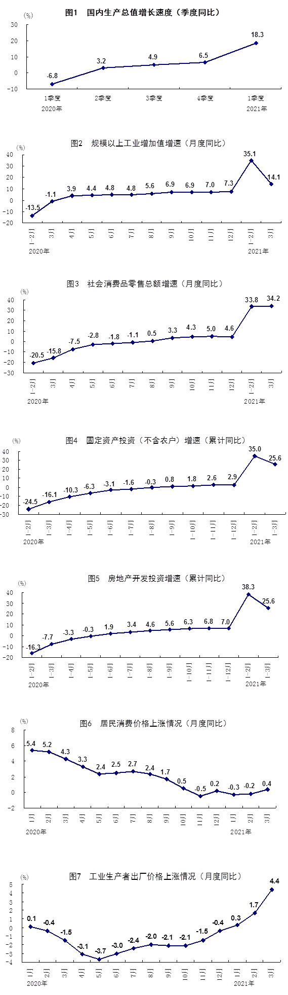 初步核算,一季度国内生产总值249310亿元,按可比价格计算,同比增长18.3%,比2020年四季度环比增长0.6%;比2019年一季度增长10.3%,两年平均增长5.0%。分产业看,第一产业增加值11332亿元,同比增长8.1%,两年平均增长2.3%;第二产业增加值92623亿元,同比增长24.4%,两年平均增长6.0%;第三产业增加值145355亿元,同比增长15.6%,两年平均增长4.7%。一方面,一季度国内生产总值同比增长18.3%,受到上年较低基数、员工就地过年工作日有所增加等不可比因素影响;另一方面,一季度环比增长0.6%,两年平均增长5.0%,表明我国经济稳定恢复。