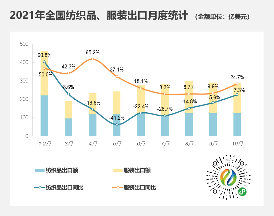 10月全国纺织品出口恢复正增长,1-10月我国纺织品服装出口同比增长6.7%
