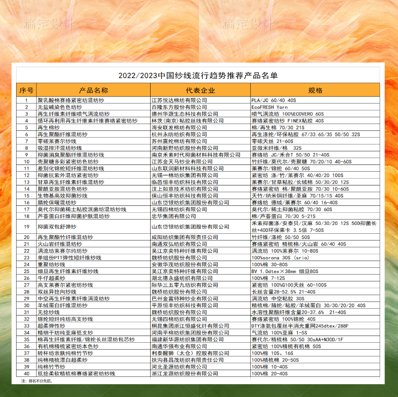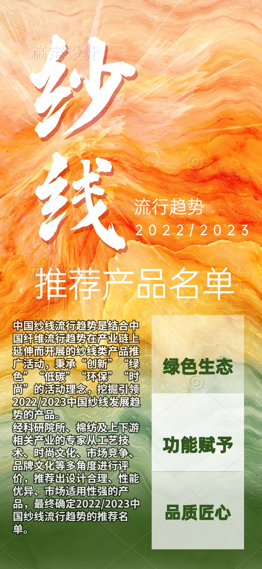 中国棉纺行业协会结合中国纤维流行趋势,秉承创新·绿色·低碳·环保·时尚理念,由业内权威专家从工艺技术、时尚文化、市场竞争、品牌文化等多角度评选出设计合理、性能优异、市场适用性强的产品,最终确定2022/2023中国纱线流行趋势推荐产品名单。
