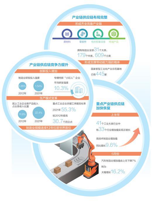 “产业链供应链是制造业的筋骨血脉,是稳住经济大盘的重要支撑。”工业和信息化部有关负责人介绍,经过多年努力,我国产业链供应链在行业、区域等方面形成了较为完整的布局。
