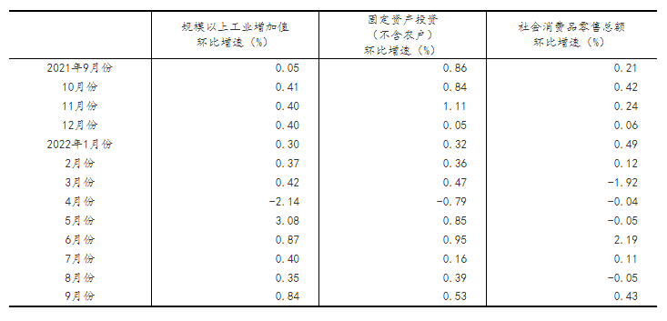(2)根据季节调整模型自动修正结果,对近一年来各期国内生产总值、规模以上工业增加值、固定资产投资(不含农户)、社会消费品零售总额环比增速进行修订。修订结果及2022年三季度GDP环比数据、2022年9月份其他指标环比数据如下: