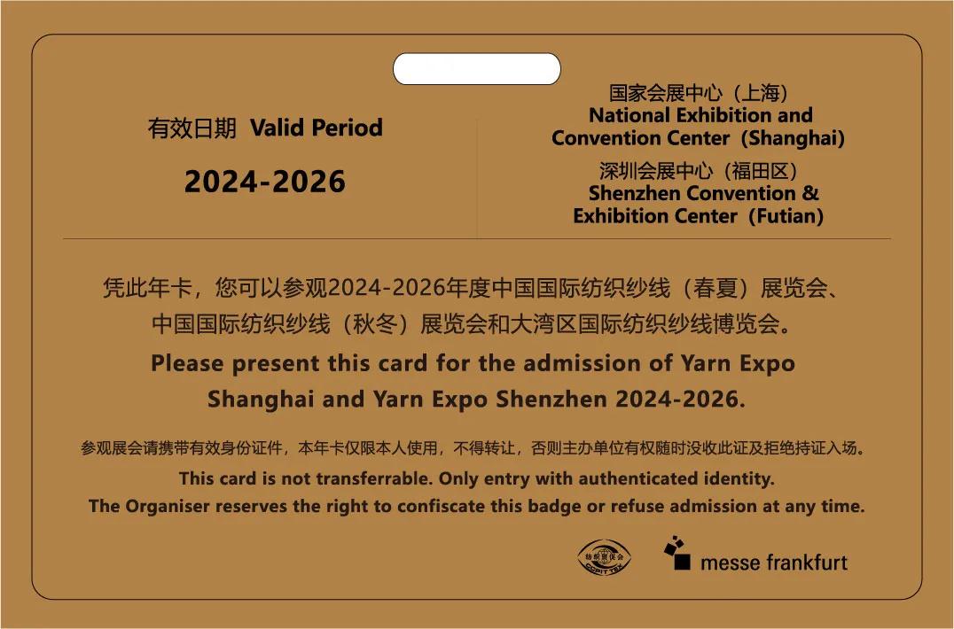Yarn Expo纱线展贵宾买家年卡是Yarn Expo纱线展组委会为专业观众提供的特别服务。贵宾买家年卡三年为一个有效周期,本周期即在2024至2026年三年内,持卡观众可凭此卡参观2024-2026年度中国国际纺织纱线(春夏)展览会、大湾区国际纺织纱线博览会、中国国际纺织纱线(秋冬)展览会,并享受主办方为您提供的系列专属服务。