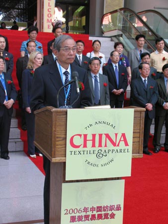 第七届"中国纺织品服装贸易展览会"今天在这里隆重开幕了,我谨代表中国纺织工业协会和中国国际贸易促进委员会纺织行业分会,向专程出席本届展览会开幕式的各位贵宾表示衷心感谢,向多年来一直关心和指导我们举办该展览会的中国驻美外交机构的同志们表示衷心感谢,向前来参观展览的美国商贸界人士和中美两国新闻界的朋友表示热烈欢迎。