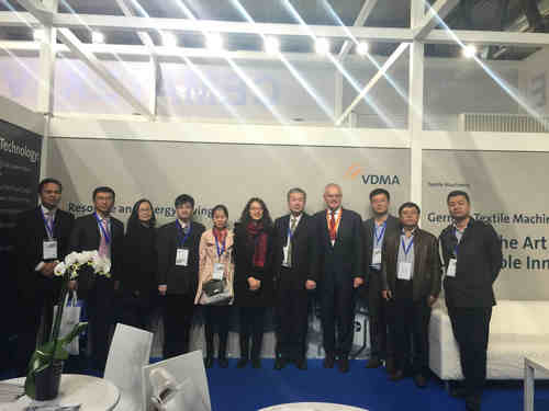 展会期间,代表团拜会了德国纺机协会副主席FRITZ P.MAYER先生和总经理Thomas Waldmann先生,就德国纺机企业和中国纺织的合作与发展交流了意见。FRITZ P.MAYER先生介绍,中国是德国最大的纺织机械市场,他们非常重视中国市场的需求。德国出口到中国的产品主要是纺纱机,整理机(包括清洗、漂白、染印),针织机和织布机。他本人和卡尔迈耶公司对中国也有很深的感情。棉纺协会叶戬春副会长称赞德国纺机企业秉承了德国制造业的高端水平和工艺严谨,对中国纺织业的发展发挥了重要的推动作用,Thomas Waldmann先生也希望能够进一步推动德国纺机企业和中国纺织业的合作交流。