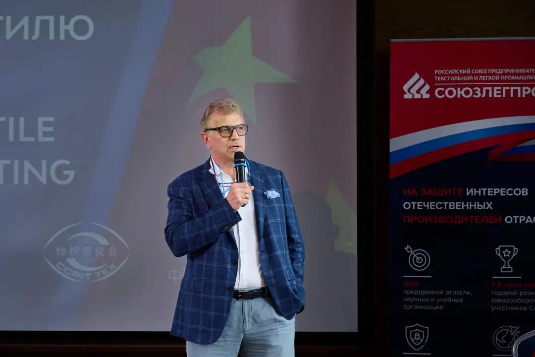 SOUZLEGPROM主席Andrey Razbrodi在演讲中指出,SOUZLEGPROM与中国纺织贸促会的积极合作正当其时。Andrey Razbrodi表示:“不必多说,世界正在发生变化。现在是合作、创新互动和重心转移的时代。我们正处于这条新道路的起点。” Andrey Razbrodi强调,新合作基础的奠定将决定纺织行业未来的发展。俄罗斯市场的容量估值在4万亿到44万亿卢布之间,相当于约400亿欧元。俄罗斯有大约25,000家中小型和大型轻工业企业。