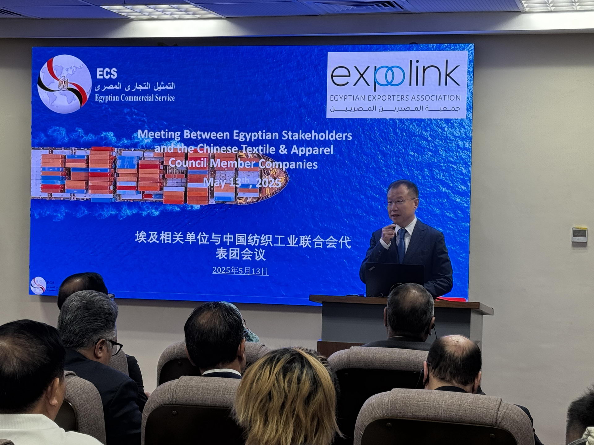 会议在埃及新开罗行政中心投资与外贸部举办,由该部公使Mr.Alaa Elbially先生主持,在开场白中,他谈到埃中两国自2014年建立全面战略伙伴关系以来,两国各领域合作取得显著发展和巨大跨越,埃及是中国在非洲重要的市场。去年5月,埃及总统塞西对中国进行了国事访问,达成了诸多合作项目。埃及政府通过努力改善基础设施、优化投资环境以吸引包括中国在内的外国投资,促进经济全面发展。他还表达了埃方政府对与中方加强纺织服装产业合作的强烈愿望,埃方承诺提供更多政策上的便利与支持,鼓励中国企业在埃及投资,同时对在埃中经济合作领域内的积极互动和对未来合作持乐观态度。据了解,目前约有2700余家中国企业在埃及运营,预计未来几年投资额将达到8亿美元。他还提到去年中国纺联代表团的成功访问和丰硕的成果推进了埃中之间的经贸合作关系,对中纺联在埃中纺织服装行业所做的工作和努力表示赞赏和欢迎。