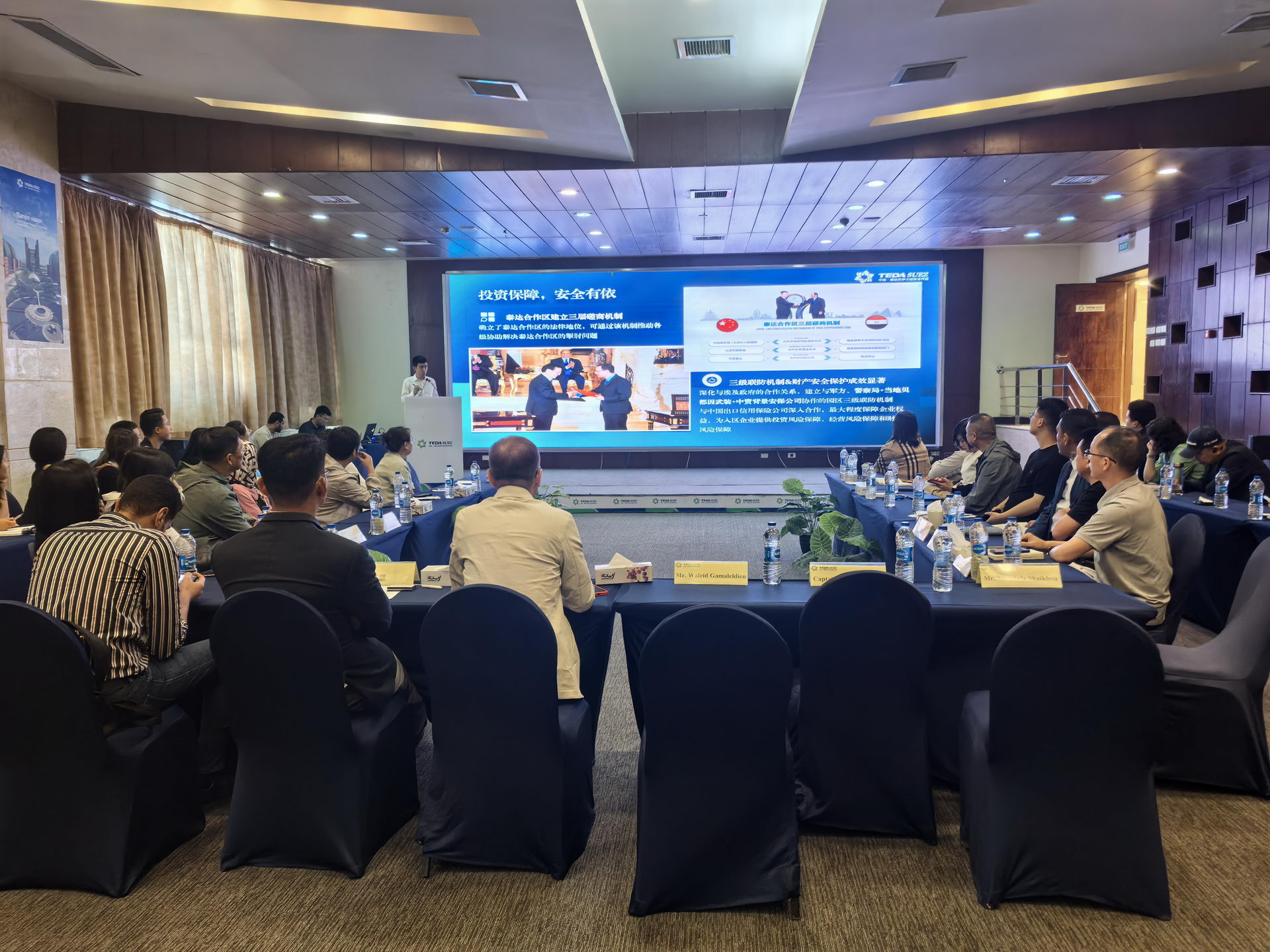 苏伊士运河经济区占地面积455平方公里,拥有6个主要港口,4个工业区,目前有15个开发商,落地投资项目达534个,创造10万个就业岗位,可以连接埃及现代化的公路网络和水运设施,从苏赫纳到马苏的第一条高速铁路将连接埃及各个重要的工业城市。在自贸区将享受100%的关税免除,覆盖1亿人口的埃及市场,并辐射20亿人口的国际消费市场。2025年一季度,吸引了245家工厂共计280亿美元的投资。苏伊士运河管理局主席Mr. Waleid Gamal Eldien表示,目前经济特区与泰达工业园区的紧密合作关系充满着广阔的发展前景,园区内完善的基础设施及电力、水、天然气及污水处理等服务,将吸引更多的中国企业落地投资。园区副主席Mr. Captain. Ahmed Gamal还重点介绍了每个园区的不同特点和产业类别以及投资激励政策并特别提到西坎他拉工业园因为靠近水系,较为适合纺织服装企业落地,目前已有14个项目入驻该园区。