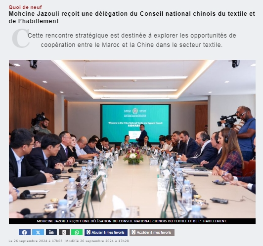 摩洛哥投资发展署(AMDIE)总经理Ali SEDDIKI 先生介绍到:摩洛哥地理区位优势明显,距离西班牙仅14公里,是连接欧盟、中东和非洲三大市场的枢纽;政府非常重视高速公路、铁路、机场、港口等基础设施的投资建设,基础设施在不断地完善;劳动人口素质相对较高,34岁以下人口占总人口的64%,拥有1,200万劳动人口,有超过300所公立和私立高等院校,每年从高校毕业学生有18万人;市场开放程度高,与欧盟、美国、土耳其等56个国家和地区签订自贸协定,覆盖十亿人口的大市场。摩洛哥政府不断改善投资环境,以鼓励和吸引外商投资。摩洛哥纺织和服装工业协会(AMITH)会长El Ansari Anass先生谈到,纺织服装业是摩洛哥解决就业最多的行业,从业人员22万人;全国共有1,600多家纺织服装企业,产值占该国GDP的15%;出口额66亿美元,占到摩洛哥总出口额的1/4;生产产品超10亿件。摩洛哥纺织服装业希望与中国纺织企业,尤其是纱线、面料、印染等企业建立长期合作关系,并希望上述企业能在摩洛哥投资建厂,利用摩洛哥地缘优势、贸易优惠政策以及良好的产业基础与营商环境,实现两国行业的共赢发展。会后,摩洛哥多家主流媒体对此次会见进行了报道。