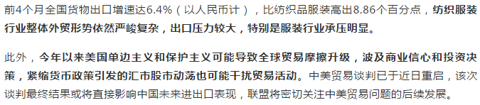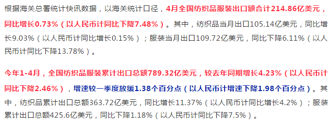 1-4月全国纺织品出口增长较快,服装出口同比下降