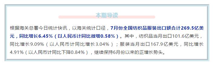 7月全国纺织品服装出口稳步回暖