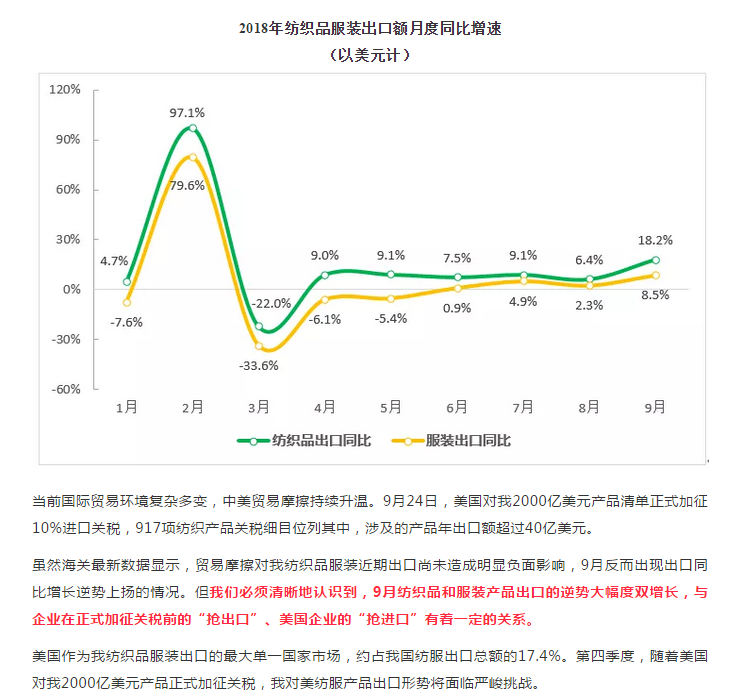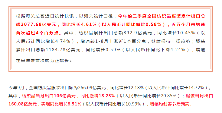 9月出口逆势上扬,前三季度全国纺织品服装出口增长4.61%