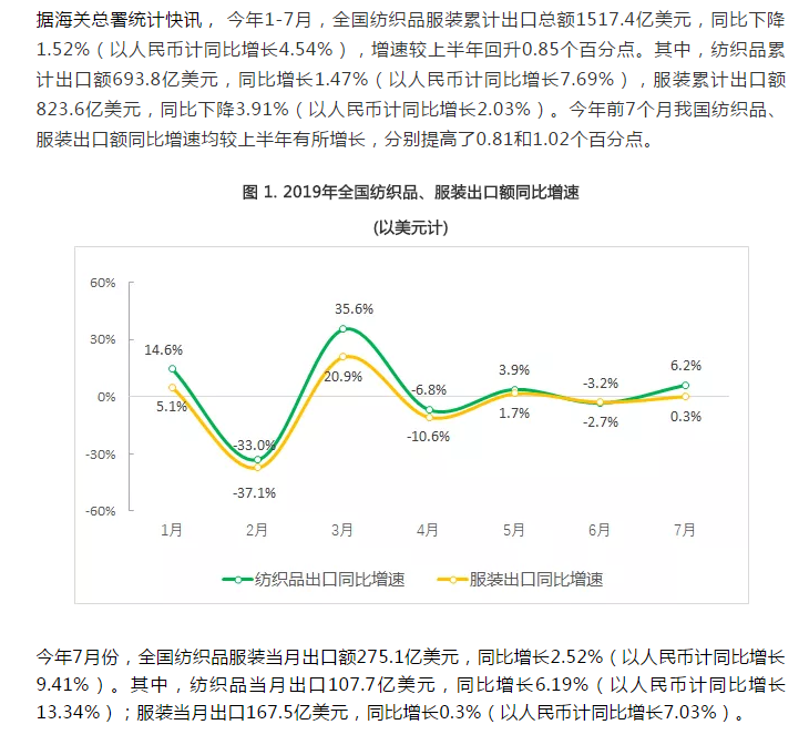 快讯丨7月全国纺织品出口以人民币计增长超过13%