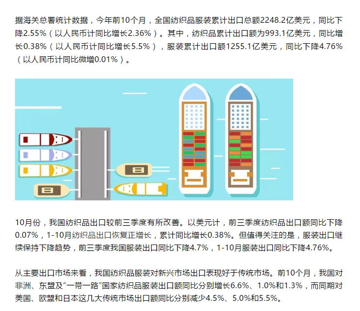 贸易丨1-10月份全国纺织品出口恢复正增长