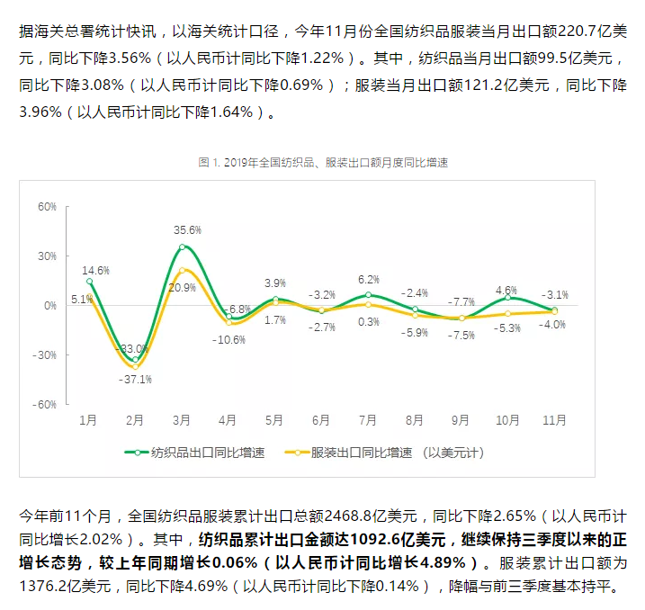 快讯丨今年前11个月全国纺织品出口保持增长,服装出口有所下降