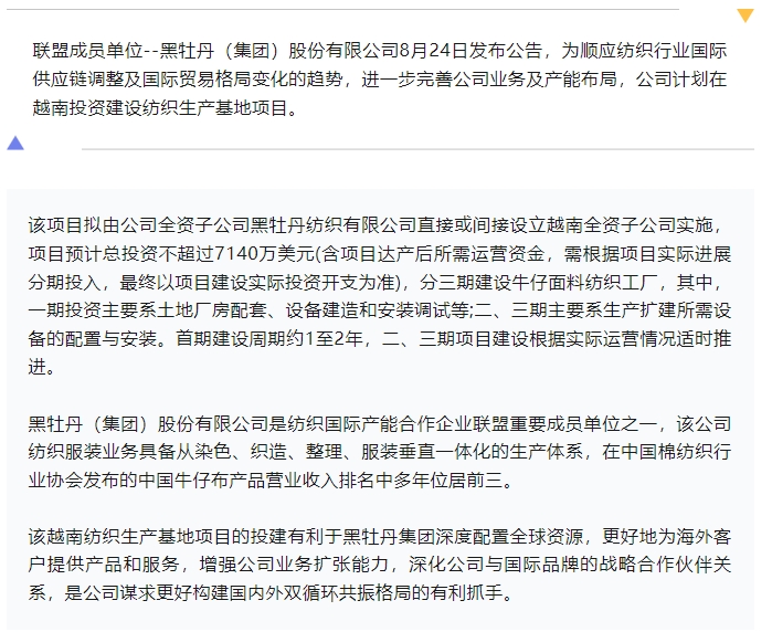 企业动态 | 黑牡丹:拟设立越南子公司,投建越南纺织生产基地项目