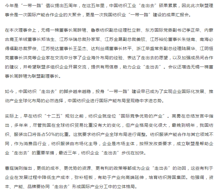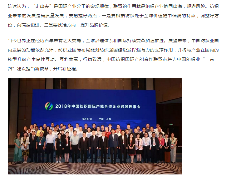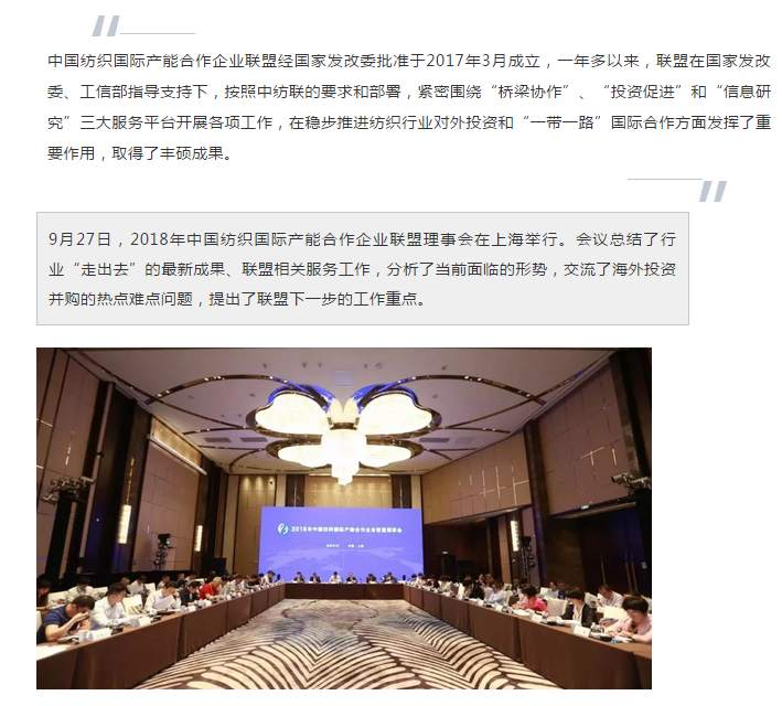 聚集纺织国际产能合作新能量,2018年中国纺织国际产能合作企业联盟理事会在上海举行