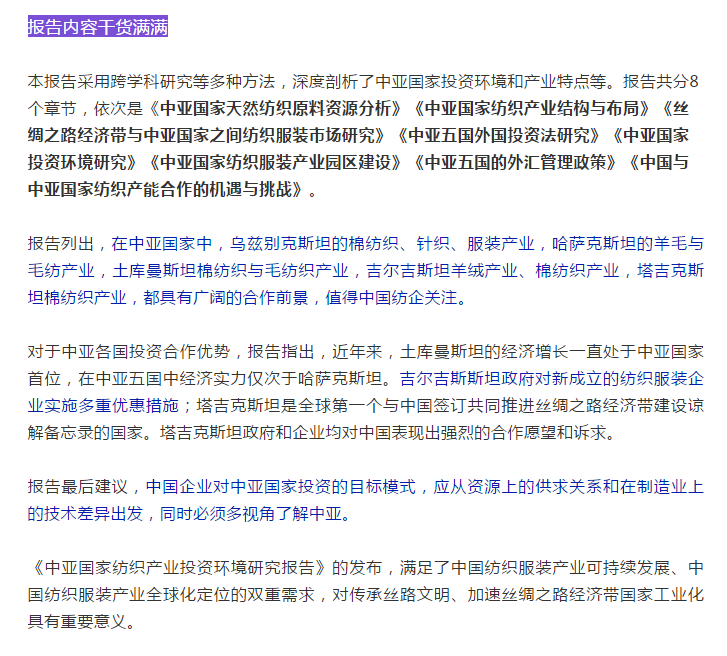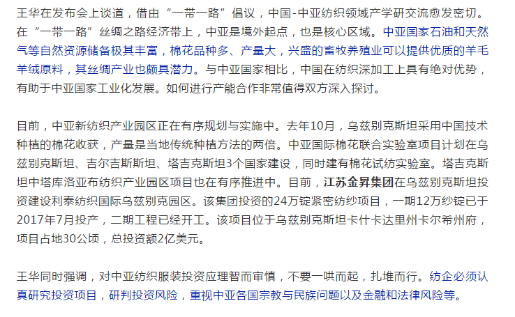 《中亚国家纺织产业投资环境研究报告》成果在京发布