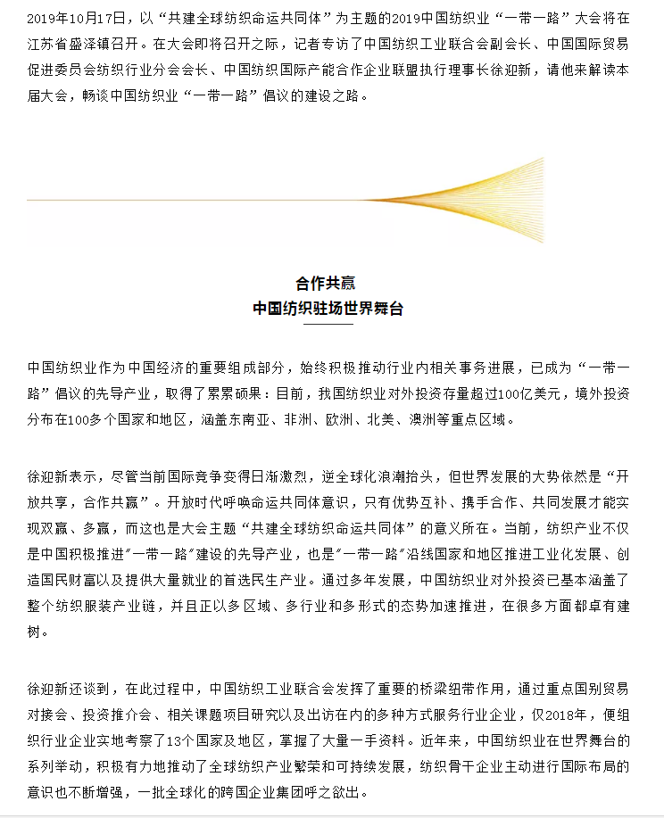 来源: 中国纺织国际产能合作企业联盟 | 发布日期:2019-10-12